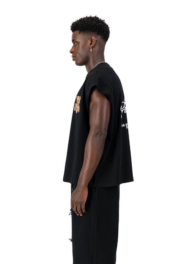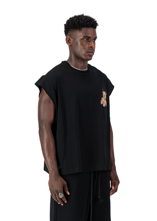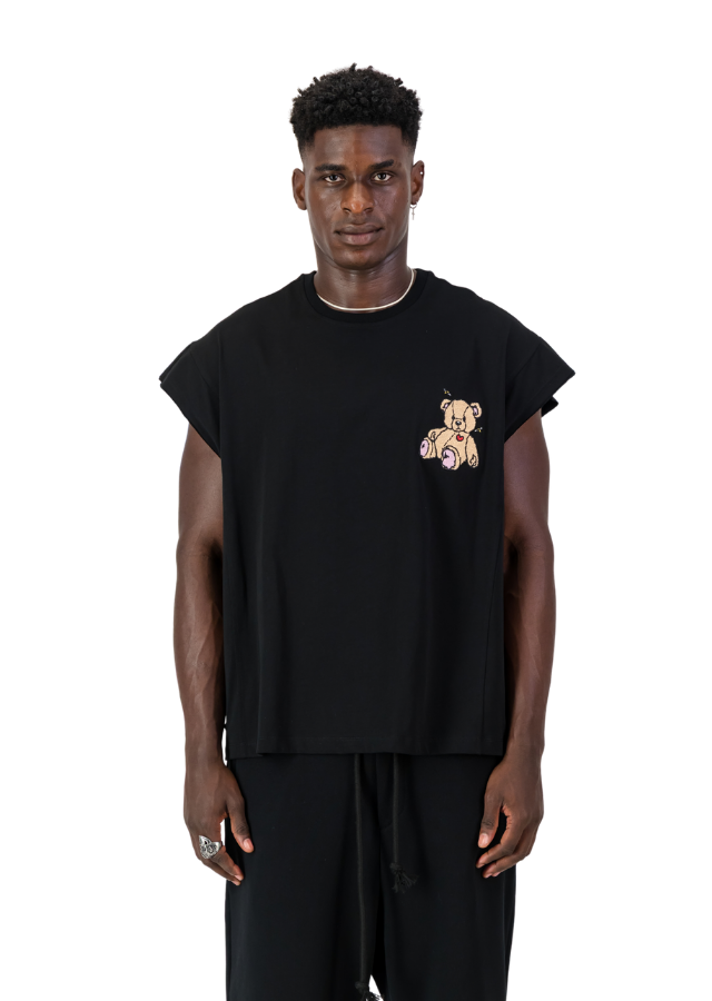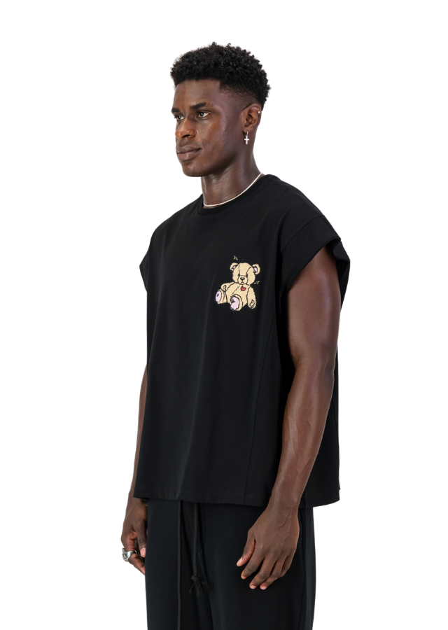 Black armless Tee with oversized Fit. Teddy Bear embroidery on the chest. "Have a Groovy Day" printed on the back.